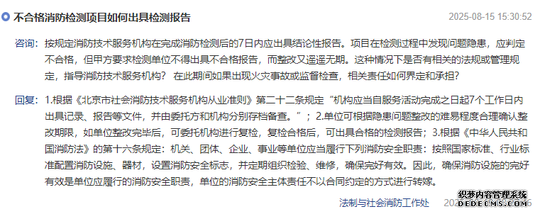 按规定消防技术服务机构在完成消防检测后的7日内应出具结论性报告。项目在检测过程中发现问题隐患,应判定不合格,但甲方要求检测单位不得出具不合格报告,而整改又遥遥无期。这种情况下是否有相关的法规或管理规定,指导消防技术服务机构?在此期间如果出现火灾事故或监督检查,相关责任如何界定和承担?